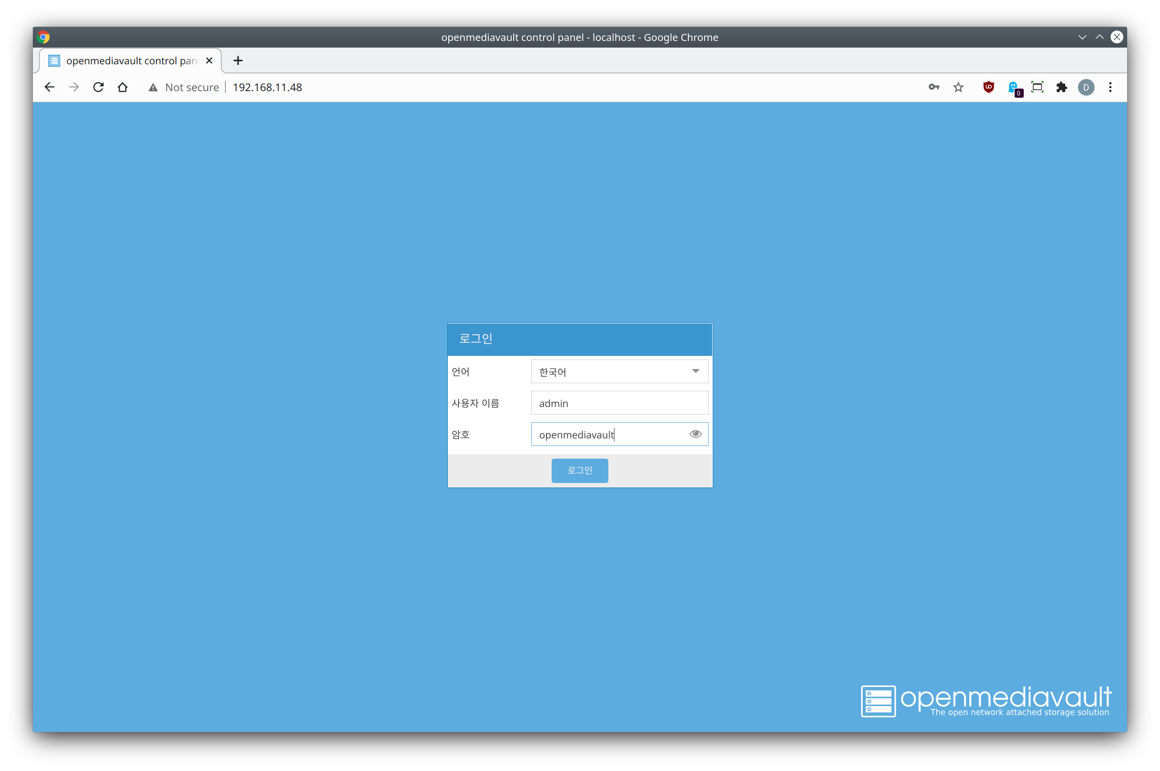 재부팅 후, 정상적으로 OMV가 설치되었다면 이제 웹으로 접속할 수 있습니다.